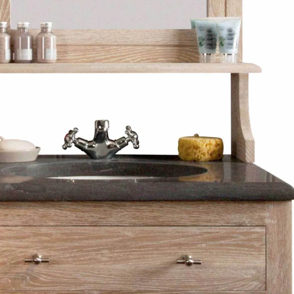 - Oberfläche der Kommode mit Steinplatte, darin eingelassen ein Keramik-Waschbecken