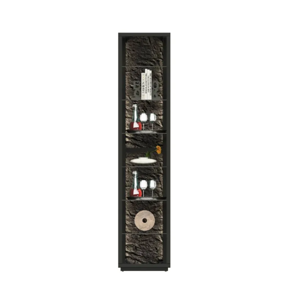 - Offenes Fach mit einem Glasboden, Rückwand Rioja-Felsenoptik in Grau-Braun, MDF Rahmen schwarzgrau lackiert