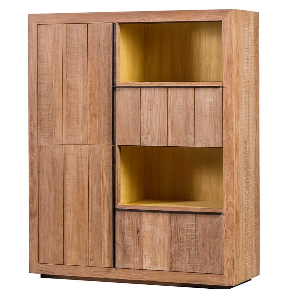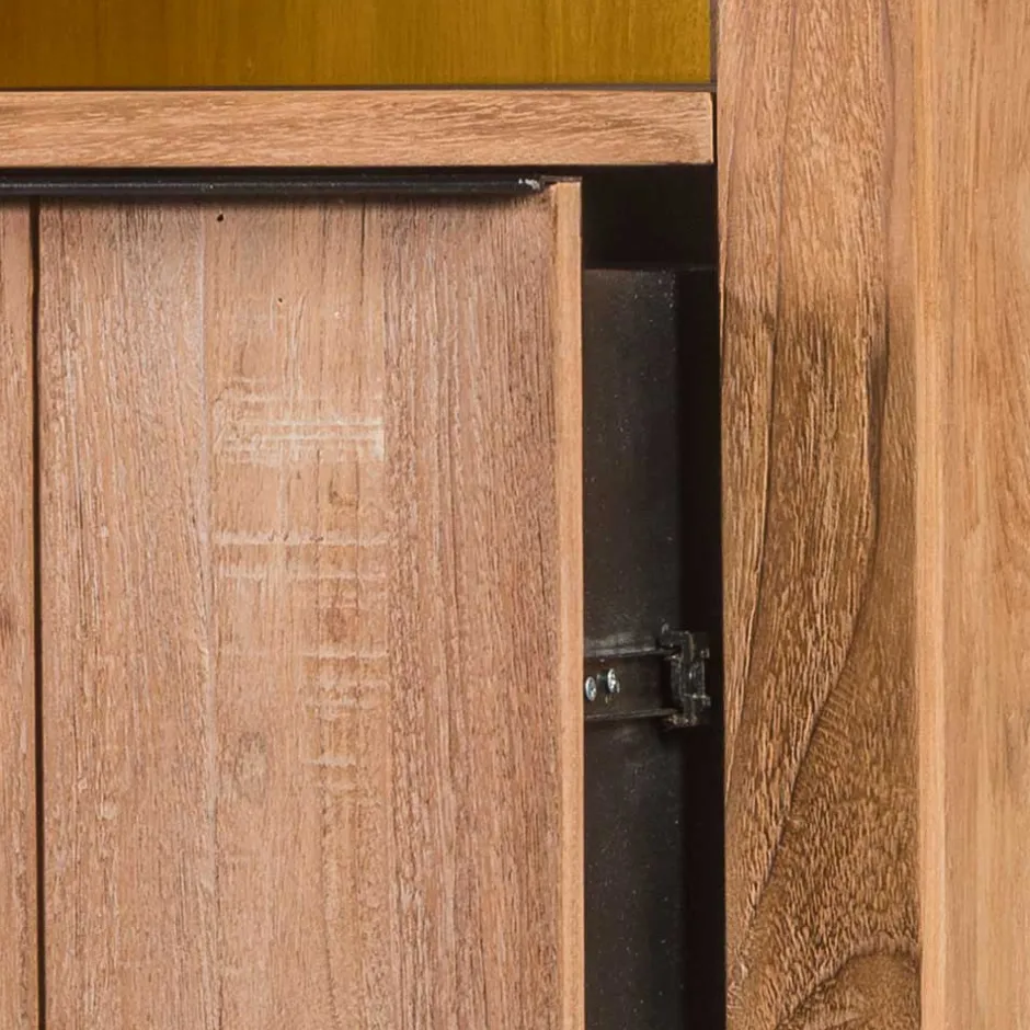 - Aus massivem Teakholz (Front, Sockel) und mehrfach verleimtem Schichtholz (Korpus, Einlegeböden) hergestellt